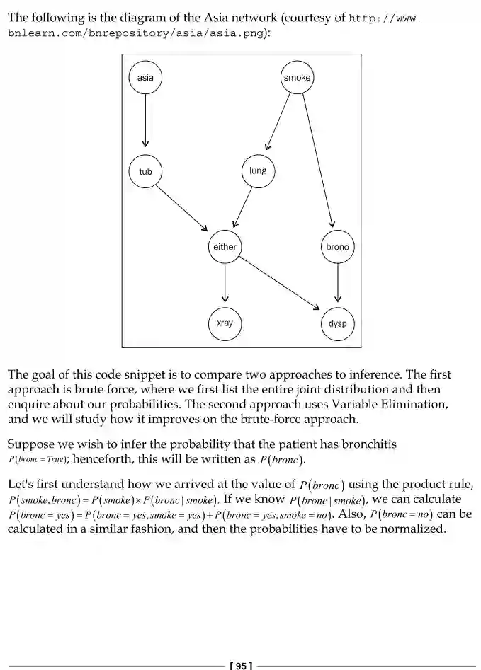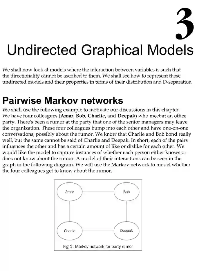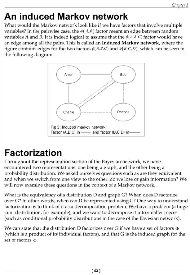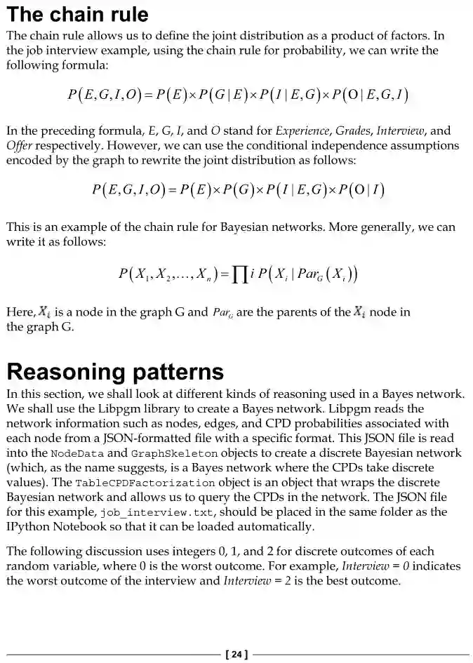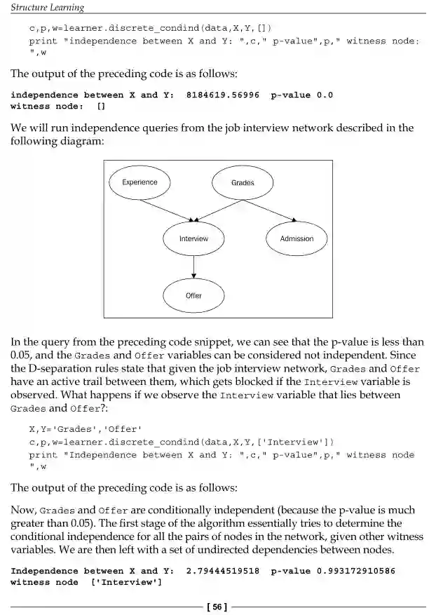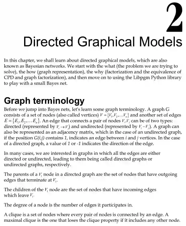 第2章:有向图形模型,提供了关于贝叶斯网络的信息,他们的属性相关的独立性,条件独立性,和D分离。本章使用代码片段加载贝叶斯网络并理解其独立性。