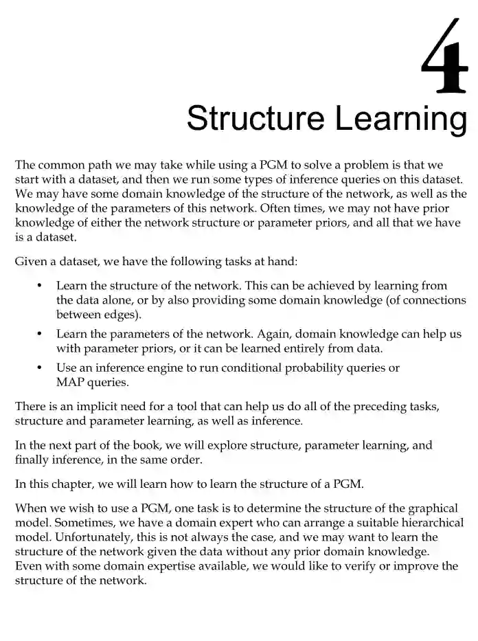 第四章:结构学习,涵盖了使用数据集来推断贝叶斯网络结构的多种方法。我们还学习了结构学习的计算复杂性,并在本章使用代码片段来学习抽样数据集中给出的结构。