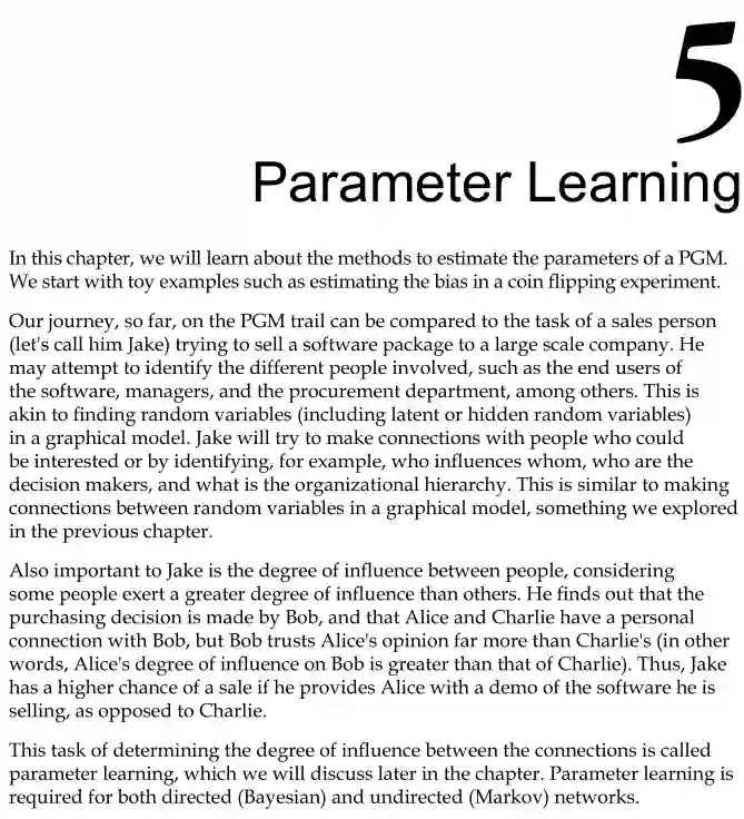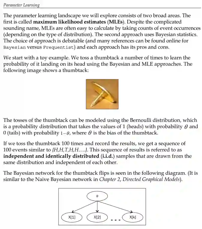 第5章:参数学习,介绍了参数学习的最大似然法和贝叶斯方法。