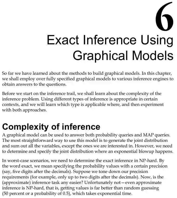 第6章:使用图形模型的精确推理,解释了精确推理的变量消除算法,并探索了使用相同算法回答我们的推理查询的代码片段。