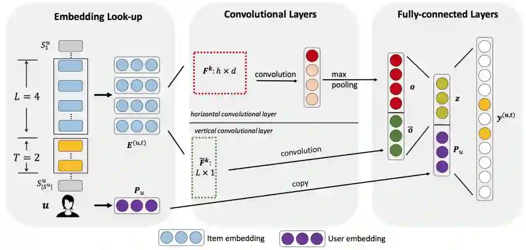 在全连接层中,如图2右边部分所示,作者将这两个卷积层的输出串联起来,并将它们输入到一个全连接的神经网络中,以获得更高层次和更抽象的特征。为了提取用户的一般喜好,作者还将用户embedding表示连接到卷积层的输出表示中,并将它们投影到有N个节点的输出层。向量Z表示用户的短期兴趣,而向量 则代表了用户的长期兴趣。最后,作者将用户嵌入到最后一个隐藏层中,原因如下:(1)使其具有推广其他模型的能力。(2)可以用其他广义模型的参数对模型参数进行预训练,这种预训练对模型性能至关重要。