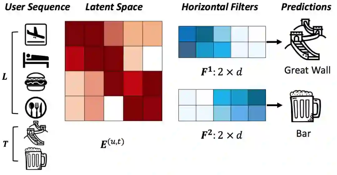 将前L个物品在隐空间的表示(L×d的矩阵E)看作一张“图像”,该方法是利用卷积滤波器对其进行序列模式的搜索和学习。如图2所示,两个水平滤波器(用h×d的矩阵表示,图中所示h=2)通过在矩阵E上滑动来提取两种不同的联合级序列模式。其中第一个滤波器通过与“机场”和“酒店”的embedding表示的交互,跳过“快餐”和“餐馆”,提取出“(机场,酒店)→长城”的模式。第二个滤波器提取了“(快餐,餐馆)→酒吧”的序列模式。矩阵方块中颜色越深代表值越大。因此,水平滤波器可以被训练来提取具有多个联合大小的联合级模式。
