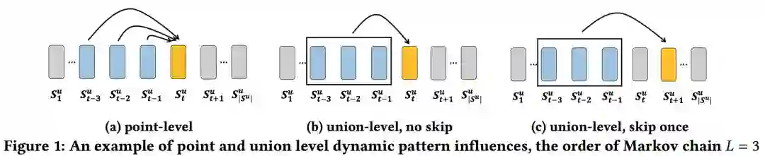 (1)未能对联合级序列模式进行建模。如图1(a)所示,马尔可夫链建模的仅仅是点级顺序模式,其中先前的每一个动作(蓝色)都是单独地而不是集体地影响目标动作(黄色)。FPMC和Fossil也属于这类。这种点级信息的聚合对于建模图1(b)所示的联合级影响是不够的,图1(b)所示的是先前的几个行为按着这个顺序,联合起来影响目标行为。例如,同时购买牛奶和黄油比单独购买牛奶或黄油的概率更高;购买RAM和硬盘比只购买其中一个组件更能说明下一步购买操作系统的情况。