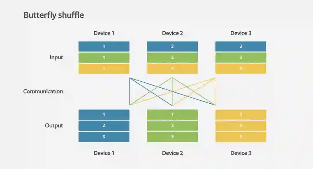 DLRM 基准模型提供了并行化的解决方案。它通过一种名为 butterfly shuffle 的机制,将每个设备上 minibatch 的嵌入矩阵分割成多个部分,并分配到所有设备上。如下图所示,每种颜色代表 minibatch 中的一个元素,每个数字代表一个设备及其分配到的嵌入矩阵。Facebook 研究团队计划优化这一系统,并在以后的博客中公开详细的性能细节。