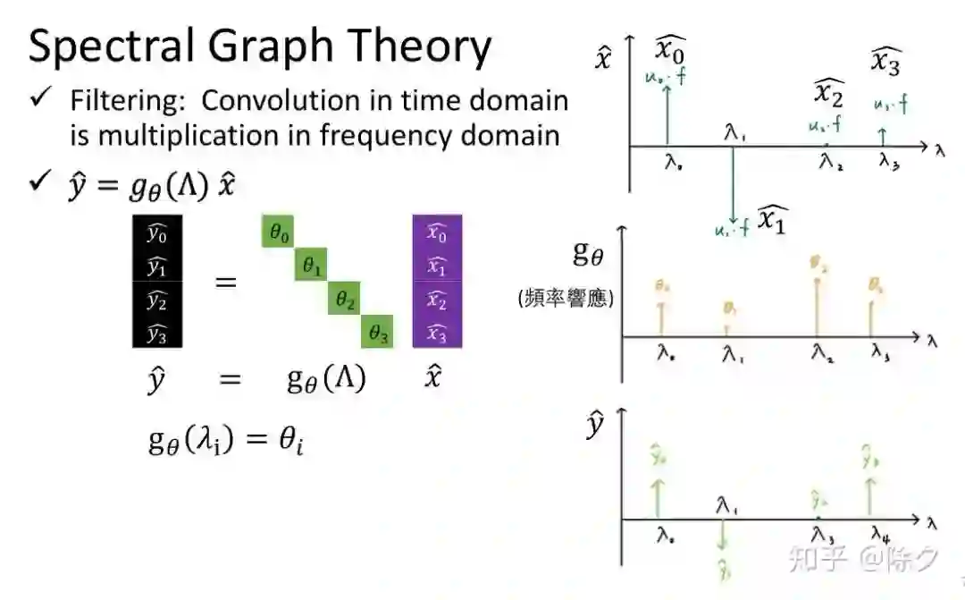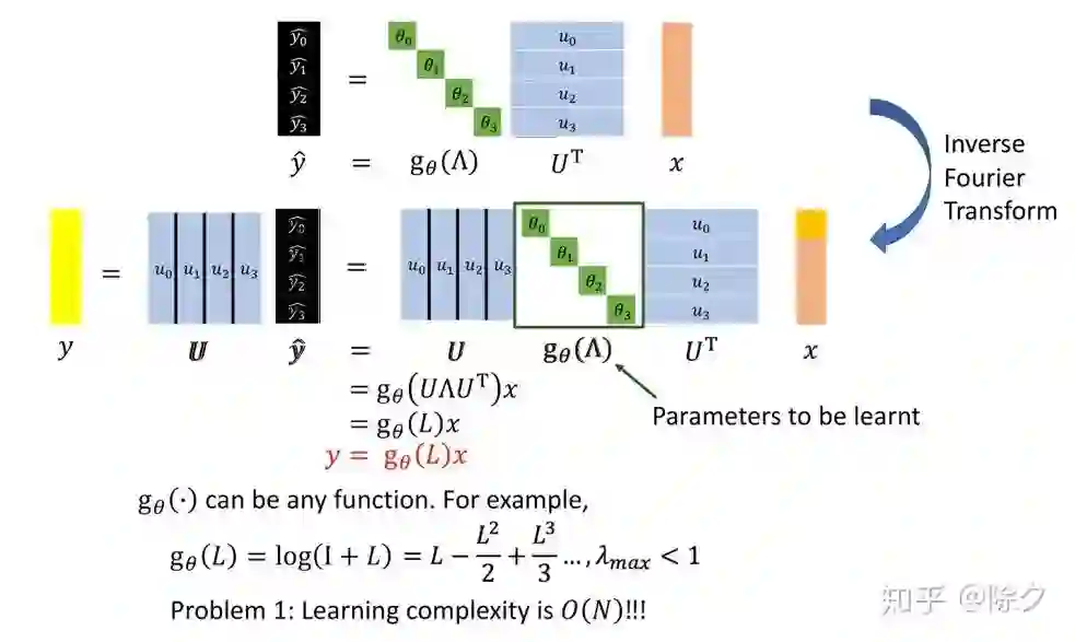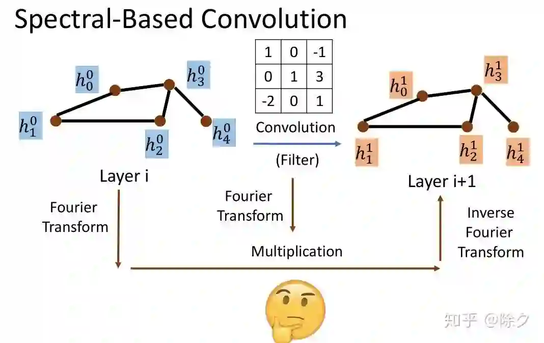 另一种给图做卷积的思路是,我们尝试把一个图上的信号(把特征看作是信号),通过傅里叶变换到频域空间,乘上频域空间上的卷积核,再傅里叶逆变换回来。