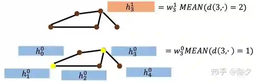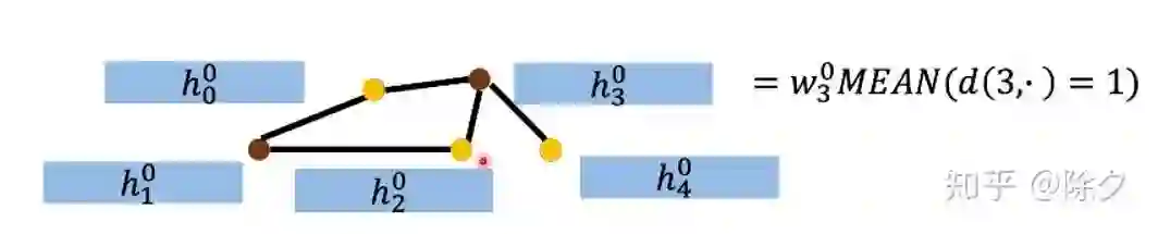 到了第二层,它会比 NN4G 多往外拓展一层感受野,计算距离为 2 的邻居。也就是{v0, v2, v4} 的除了 v3 的邻居 {v1}。