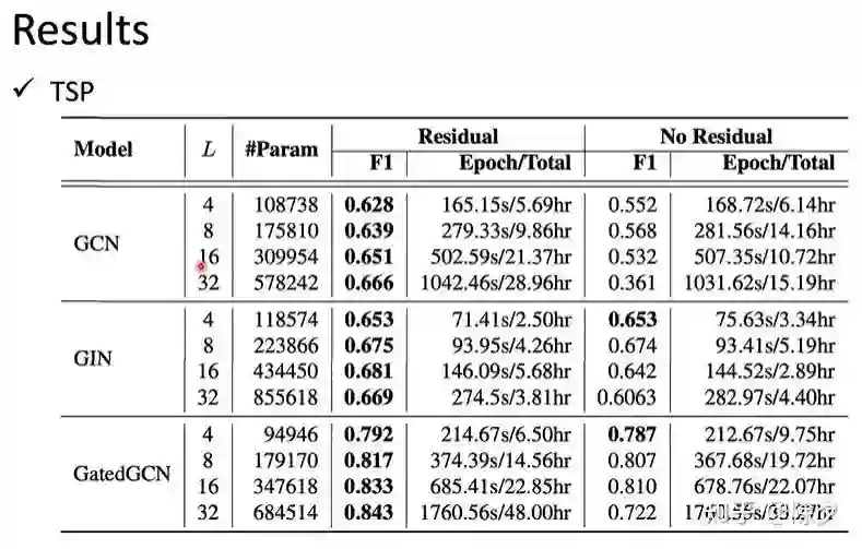 我们再回过头来看 GCN 在 TSP 任务上的 Benchmark。TSP 是一个边分类任务。GCN 在没有加残差连接的情况下,随着层数增加表现是显著下降的。