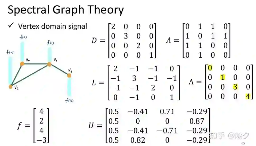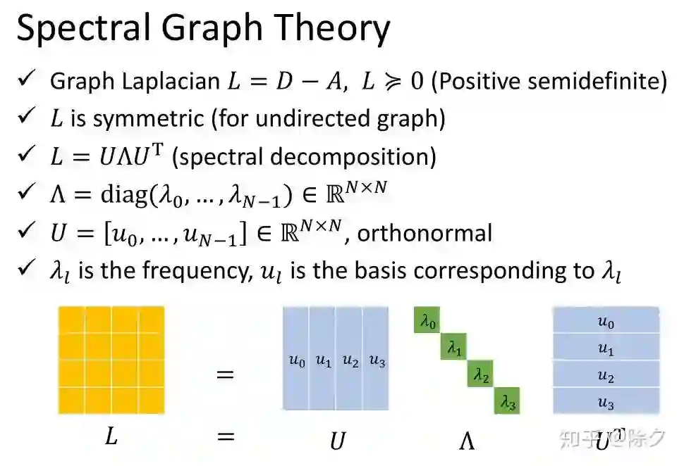 。L 的定义保证了它是半正定的。无向图保证了 L 是对称的。这样我们就可以对矩阵 L 做特征值分解。L 可以分解成