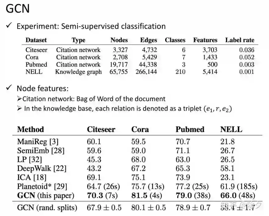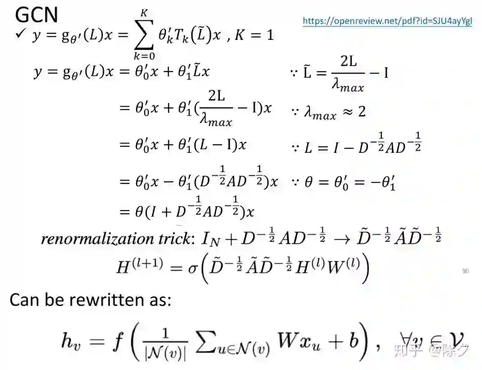 受到 ChebNet 的启发,一种更加简单的图卷积变种 GCN 被提出来了。它相当于对一阶切比雪夫图卷积的再近似。我们在切比雪夫卷积核定义基础上,令多项式的阶数为 1,再让拉普拉斯矩阵 L 的最大特征值为2。这样图卷积运算过程可以被进一步简化。GCN 的卷积核变得更小,参数量也更少,计算复杂度也随之减少。它等价于最简的一阶切比雪夫图卷积。在化简中,它使用了一个重归一化技巧。它能将特征值范围进一步缩小使得滤波器变得更加低通。解决的问题是[0,2]范围内的特征值在神经网络中使用多次后,会导致梯度消失和梯度爆炸的问题。ChebNet 虽然比 GCN 复杂度更高,但它的表征能力更强。但我们可以通过堆叠多个 GCN 来扩大图卷积的感受野,所以灵活性比 ChebNet 更高。重要的是复杂度更低的 GCN 会更容易训练,速度快且效果好,实用性强。所以它成为了被提到最多的典型方法。