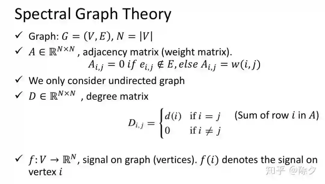图结构为节点信号在空间上的关系。我们可以把这个空间上的图转换为频域上的图。对这个图的频谱进行滤波操作后,再转换回空间上的图,就可以实现卷积过程。我们要如何把空间上的图变成频域上的图呢?这里需要了解一下谱图理论。