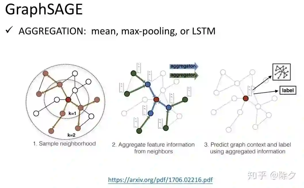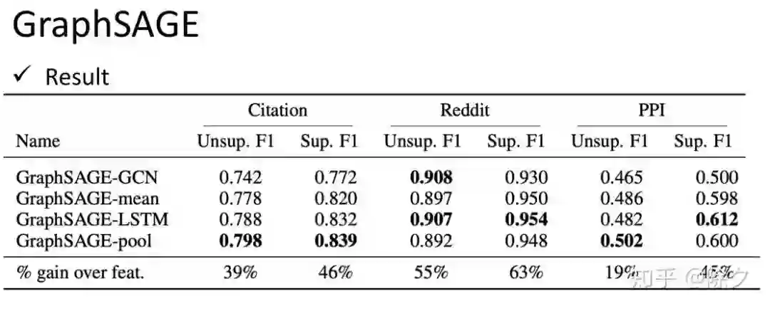 GraphSAGE 比较了 Aggregate 用 mean, max-pooling 和 LSTM 等各种情况。它尝试把邻居的信息喂给一个 LSTM 取最后的隐层作为输出,来作为聚合后的信息更新每层。它会随机地采样出一个邻居顺序,每次更新都会用不同的顺序。以此来去忽略不同顺序的影响,来学到比较好的聚合信息。