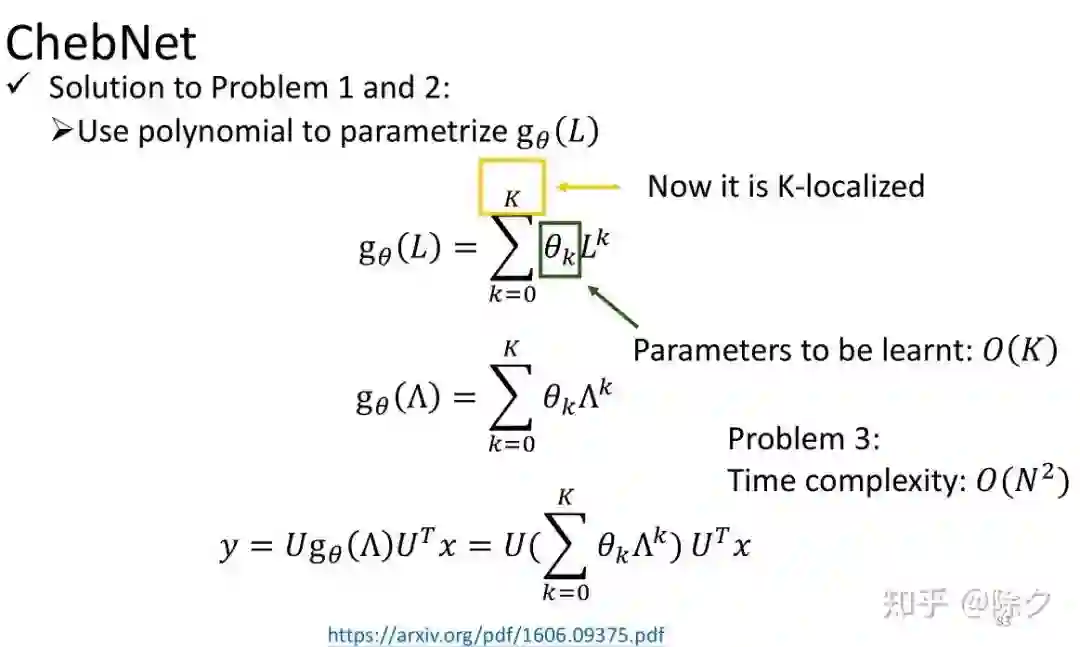为解决这两个问题,出现了 ChebNet。它让 g(L) 是一个多项式函数,来近似计算图卷积。最高次数 K 是定义好的。所以它能够因K的固定而变得局部化。而且它要学的参数空间复杂度为 O(K)。但我们在用它计算y的时候,它需要乘上傅里叶基U,让时间复杂度变成了