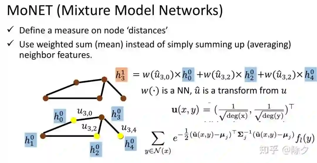 DCNN 在扩大感受野的过程忽略了一点在,它把每个邻居之间的距离都默认为了1。但事实上,邻居与邻居之间应该有不同的距离权重。MoNET 则考虑了这一点,它使用的是距离的加权求和。MoNET 通过定义某个权重的方式来决定节点与节点之间的距离。我们用 u(x, y) 来表示节点 x 到节点 y 的权重。它是一个二维的向量,维度取值为