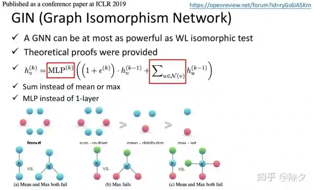 GIN这篇论文从理论上说明了为什么有些方法会Work,但有些方法不会Work。它证明了最佳的聚合更新方式。对于某个节点 v,它在第 k 层的隐层应该要把它全部的邻居都加起来后,再加上某一个常量乘上节点自身的隐层,再通过一个线性映射。我们要用sum,而不是mean或max,是因为对于有两个邻居的节点和有三个邻居的节点,mean和max都无法区分它们是不同的图。