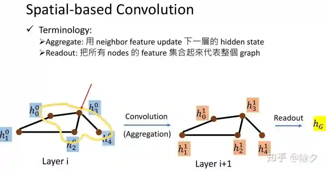 一个图的节点通常是用一个嵌入向量来表征的。信息聚合意思是,让包含一个节点信息的嵌入向量,也表征了它周围节点的信息。在 Spatial-based Convolution 中,我们需要有两个信息聚合的操作:一个是用邻居特征更新下一层的隐层,叫 Aggregate,另一个是把所有的节点的特征聚合成一个代表整个图的向量表征,叫Readout。