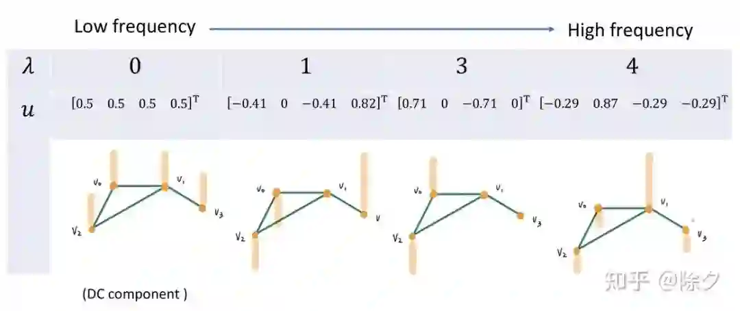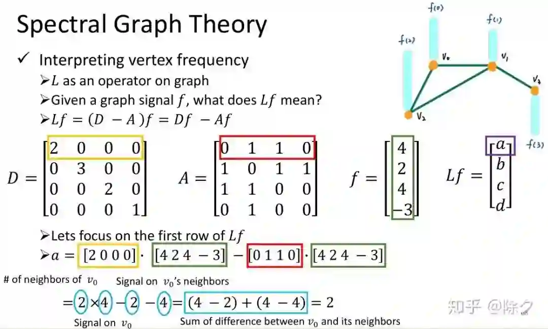 我们可以把 L 当作是一个用来对图操作的矩阵。给定一个图的信号f,用 L 与它相乘,Lf = (D-A)f = Df - Af。它所做的操作刚好等价于当前节点与它周边邻居的能量差异之和。频率越大,相邻节点的能量变化也就越大。
