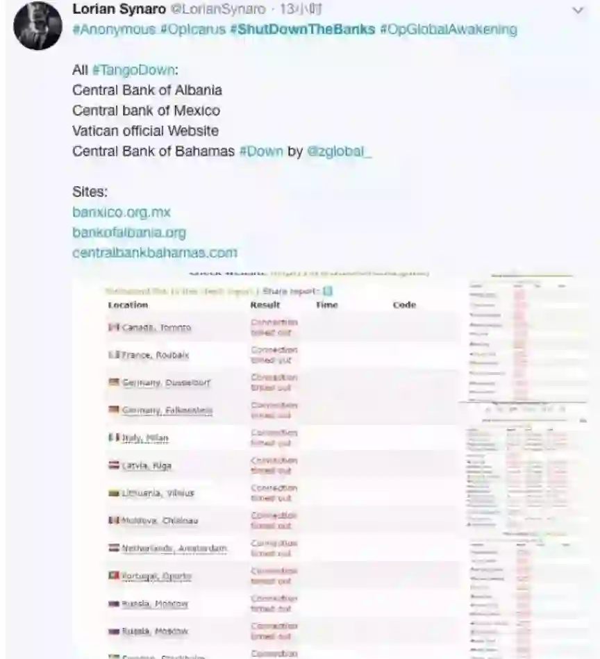 近日,阿里云监控发现,匿名者(Anonymous)组织成员正在发起针对全球中央银行网站的攻击行动,截止目前,国内有超过2家以上的重要网站被攻击,攻击特征主要为DDoS攻击和CC攻击。