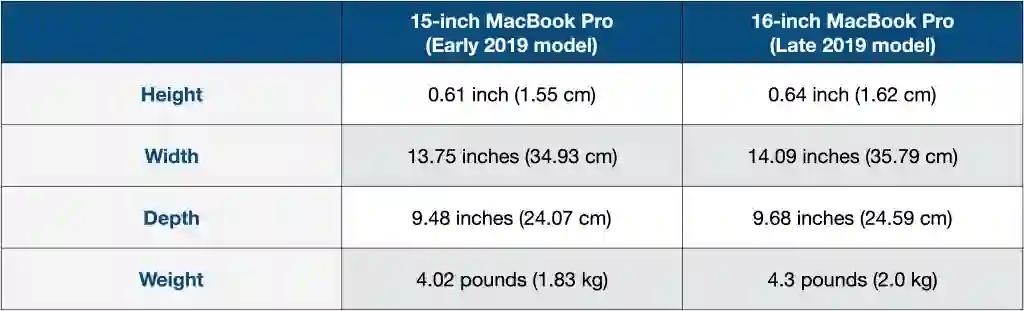 16 英寸 MacBook Pro 比上一代产品更大,更厚,更重。对于通常更关注性能的专业用户来说,这应该不是什么问题。我们来看看 MacBook 的尺寸和重量规格。