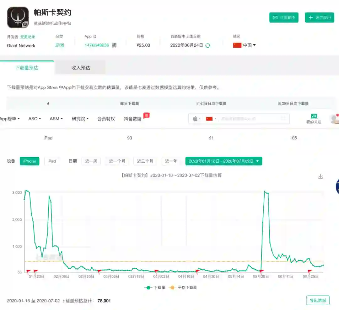 「子弹财经」在七麦数据查询了解到,《帕斯卡契约》1月16日-7月2日的iPhone下载量预估为7.8万,iPad下载量预估为1.68万。
