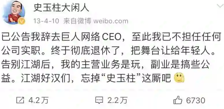 直至2013年,史玉柱才终于成功从巨人网络退休,过上了闲云野鹤的生活。