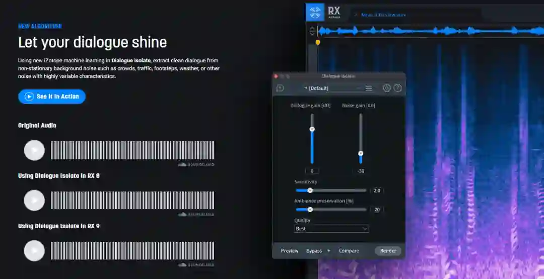 izotope RX9 是一款让声音更具创造性的降噪插件,RX系列的三大特点是高效降噪、智能处理以及多平台应用,这款插件可以从多种背景噪音中获得更干净纯粹的声音体验,新动态模式可以在不影响音频质量的前提下,安全消除嗡嗡声、铃声或其他干扰声。