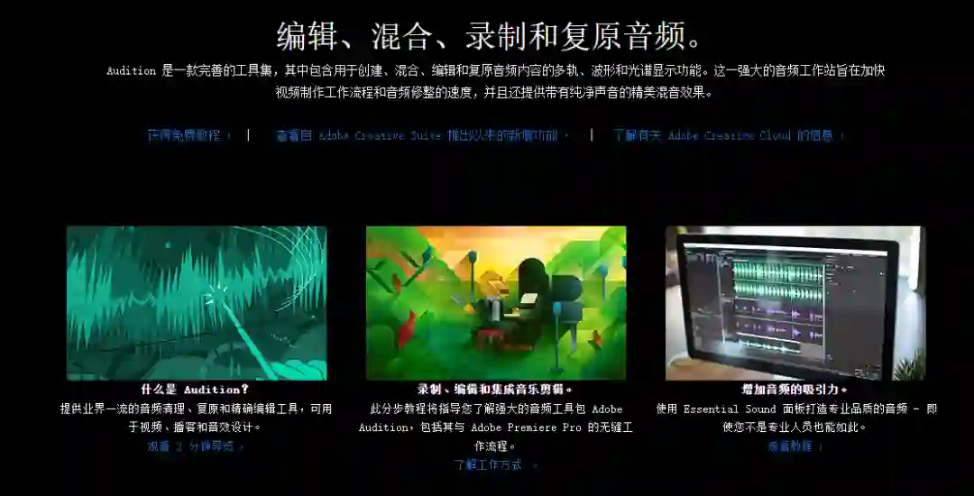 Audition 是一个专业的音频工作站,其中包含用于创建、混合、编辑和复原音频内容的多轨、波形和光谱显示功能,能加快视频制作工作流程和音频修整的速度,并且还提供带有纯净声音的精美混音效果。