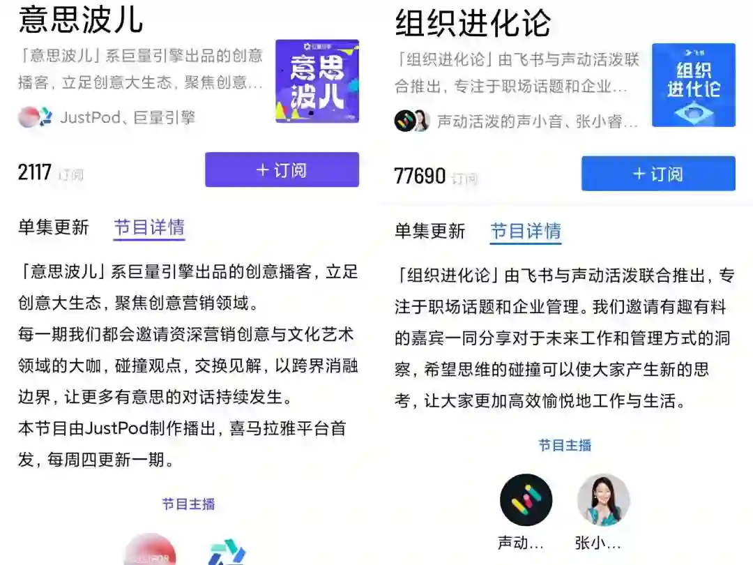 图为JustPod、声动活泼分别为巨量引擎、飞书定制的品牌播客