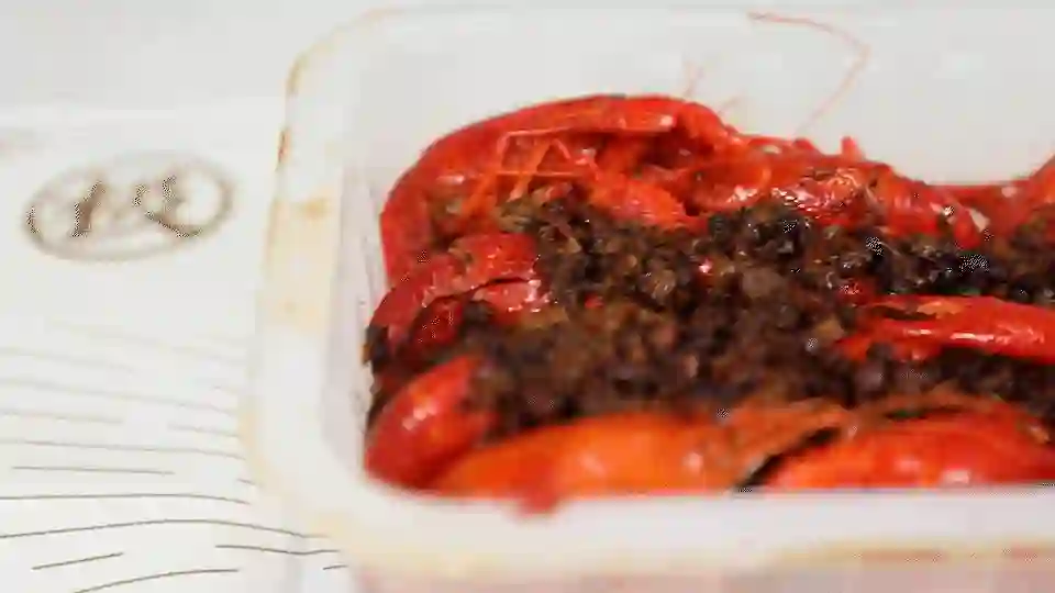 口味却一言难尽,虾腮已经变成了暗黄色,虾肉松散死板,还有土腥味儿,