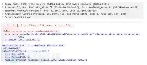 接下来,恶意软件会通过SMTP协议并将导出数据+系统信息+执行日志以附件的形式发送给攻击者(邮件服务器:rambler.ru/meta.ua,端口:465)。攻击者在这里使用了两个不同的邮件服务器,表明攻击者想要确保数据能够成功发送。