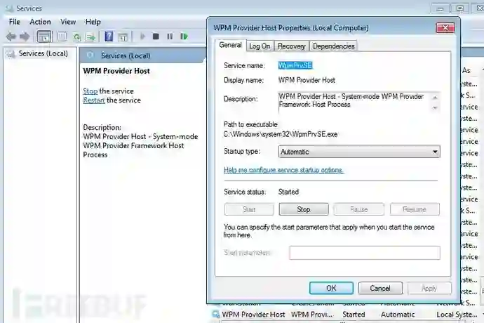 执行之后,恶意软件会在目标系统的system32或SysWoW64目录中存放WpmPrvSE.exe (标记为TROJ_DLOADER.COGBA),然后开启一个名叫WPM Provider Host的服务。下图即为该服务的相关属性: