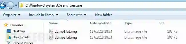 完成上述步骤之后,恶意软件会使用certutil对导出数据进行编码,然后使用WinRAR将导出文件压缩为两个文件(dump1.txt.img和dump2.txt.img),并将它们存放在一个名叫“treasure”的目录中(C:\Windows\System32\send_treasure)。