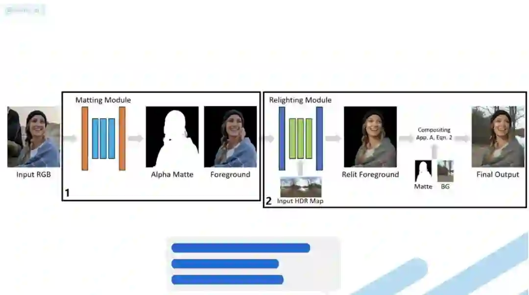 根据添加的新背景的亮度重新为肖像补光。你有没有想过改变图片的背景,但让它看起来很逼真?如果已经尝试过就会知道这并不简单。你在家里拍一张自己的照片然后改变成海滩的背景, 任何人都会在一秒钟内说“那是经过Photoshop处理的”。对于电影和专业视频,需要完美的灯光和艺术家来再现高质量的图像,这非常昂贵。你无法用自己的照片做到这一点。但是这篇论文做到了
