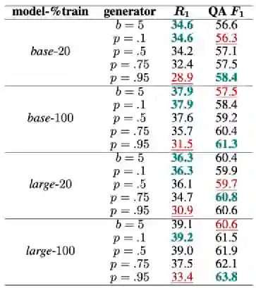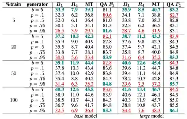 如上图,绿色代表每个指标中最优结果,红色代表最差结果。可以看出:尽管beam search在不同数据量的训练中,所有QG metrics都高于NS@p的方式,但是在QA的表现上,只有在数据量为5%时高于NS@p。上述实验对于每个答案只生成一个问题,作者还增加了一个实验,在RoBERTa-large,数据量100%,p=0.95,每个答案生成5个问题时,QA F1=86.4。