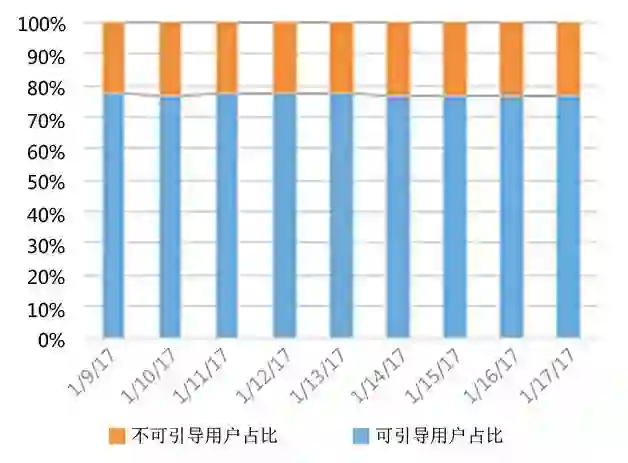 从效果看,引导和非引导次日回访率随时间逐步接近,流失率也在随时间递减,说明随时间的推移,人群的分群会逐渐稳定。从全局占比看,大部分用户都是可以引导的。