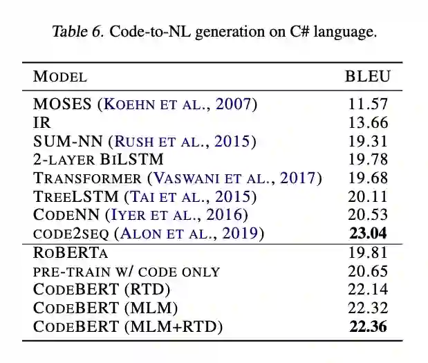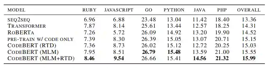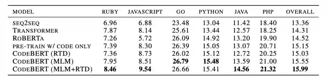 这部分研究代码到文档的生成问题,并在六种编程语言中研究了生成任务在Code Search Net Corpus上的结果。另外,为了证明CodeBERT在代码到NL生成任务中的有效性,作者采用了各种预训练的模型作为编码器,并保持了超参数的一致性。 实验结果如下:在编程语言上进行预训练的模型的性能优于ROBERTa