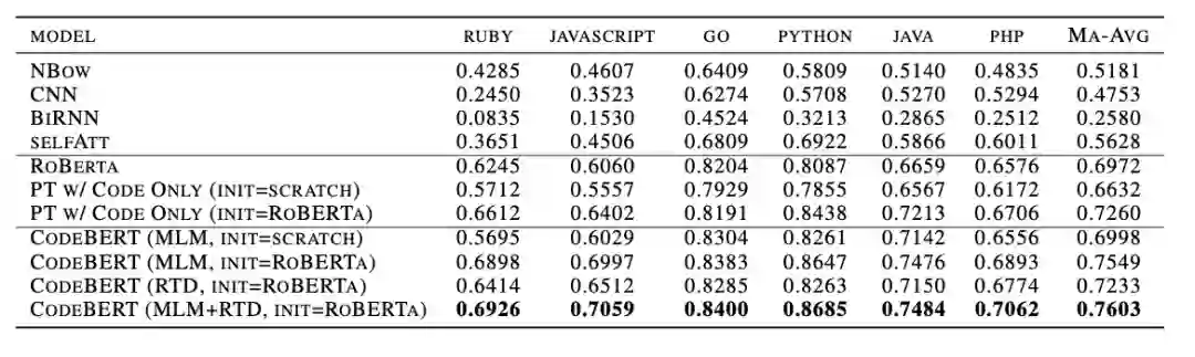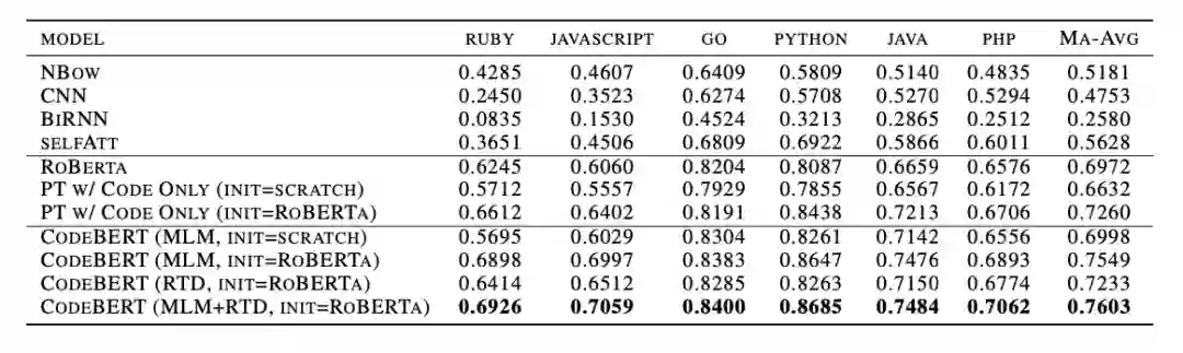 论文链接:https://arxiv.org/pdf/2002.08155.pdf 这篇论文提出了一个被称为「CodeBERT」的双模预训练模型,据作者介绍,这也是目前已知的第一个大型 NL-PL(自然语言-编程语言)预训练模型。该预训练模型能够处理NL-PL 的普遍问题,例如用自然语言搜索代码、自动生成代码等。所谓自然语言代码搜索,所要解决的问题是,如何通过自然语言query查找到所需的代码块,这和我们常用的搜索引擎(通过自然语言query来查找所需网页)类似。事实上,微软Bing在2018年便上线了类似的功能,在搜索框中输入自然语言 “convert case using a function of R”,便会返回一段 R 代码。针对自然语言代码搜索,在这篇论文里,作者在 CodeSearchNet语料库上对CodeBERT进行了预训练并做微调,这是一个包含了 6 种较为普遍的代码语言(分别为Ruby、JavaScript、Go、Python、Java、PHP)的语料库。如下图所示,他们在自然语言代码搜索任务中取得了SOTA的结果: