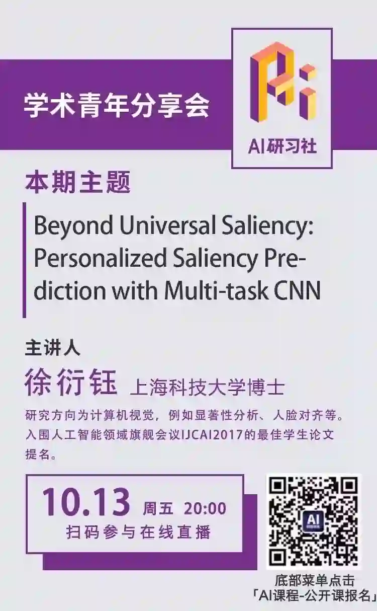 显著性检测是计算机视觉中长期存在的问题。现有的大部分研究都集中在探索用户间普遍存在的显著性模型,即缺乏对个体在性别、年龄、习惯上差异的重视。在这篇IJCAI文章中,作者首次提出了个人显著性预测任务,并建立了首个个人显著性数据库,同时提出基于卷积神经网络的多任务个人显著性预测模型(Multi-Task Convolutional Neural Network),实验结果验证了模型的良好的性能。
