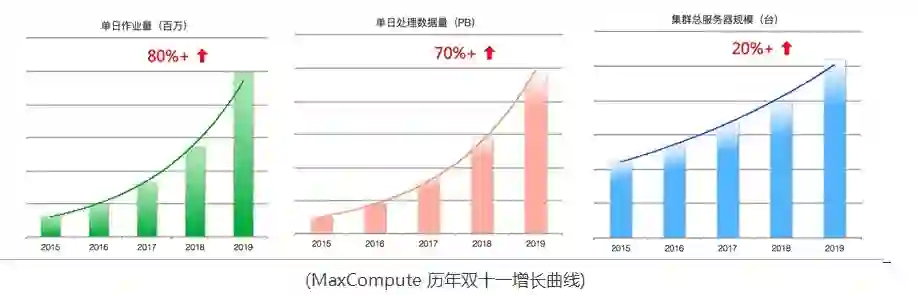 随着业务和数据的持续高速增长,MaxCompute 双十一的作业量和计算数据量每年的增速都保持在60%以上 。