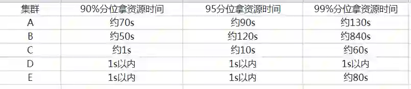 下边为主要几个集群SU拿资源的时间分布 (fuxi基本调度单元), 可以发现这几个集群90%分位拿资源的时间基本都在1分钟左右(符合线上基线作业等待资源达到90s进行抢占配置预期)。
