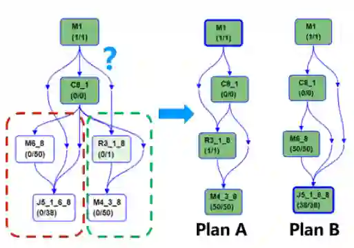 基于DAG 2.0的动态逻辑图执行能力,MaxCompute支持了开发的conditional join功能:在对于join使用的算法无法被事先确定时,允许优化器提供一个conditional DAG,这样的DAG同时包括使用两种不同join的方式对应的不同执行计划支路。在实际执行时,AM根据上游产出数据量,动态选择一条支路执行(plan A or plan B)。这样子的动态逻辑图执行流程,能够保证每次作业运行时都能根据实际作业数据特性,选择最优的执行计划,详见下图: