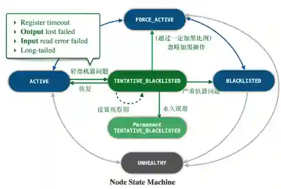 如上图所示,DAG2将机器分为多个状态。并根据一系列不同的指标来触发在不同状态之间的转换。对于不同状态的机器,根据其健康程度,进行主动规避,计算任务迁移,以及计算任务主动重跑等操作。将机器问题造成的作业运行时间拉长,甚至作业失败的可能性降到最低。