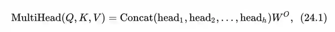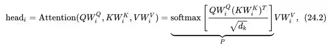式中, 代表input embedding matrices, 为序列长度, 是embedding dimension, 是head的数量,每个head的计算方法是: