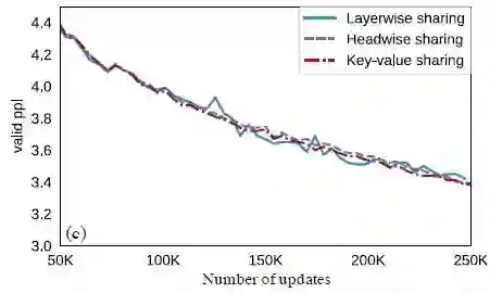 作者比较了3种参数共享策略headwise, key-value, layerwise的影响,如下图所示。图中 。结果发现每一层,每个head的2个Project matrix全部共享参数时与不共享的结果差不多。这意味着我们可以通过全局共享Project matrix参数的方法来大量减少参数量。