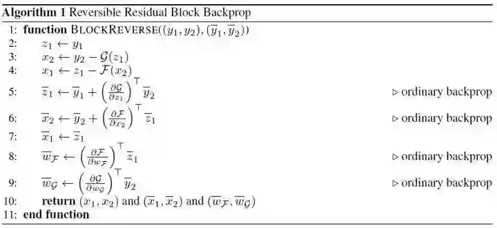 上面是torchsummary截图,forward和backward pass size就是需要保存的中间变量大小,可以看出这部分占据了大部分显存。如果不存储中间层结果,那么就可以大幅减少GPU的显存占用,有助于训练更深更广的网络。多伦多大学的Aidan N.Gomez和Mengye Ren提出了可逆残差神经网络,当前层的激活结果可由下一层的结果计算得出,也就是如果我们知道网络层最后的结果,就可以反推前面每一层的中间结果。