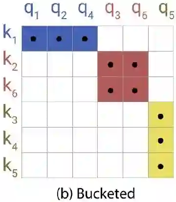 2. 做LSH bucketing,即进行hash计算,得到每个query和key所归属的桶 (不同颜色表示不同的桶),复杂度 。