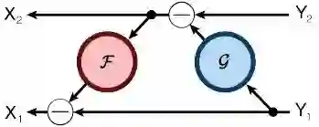 可逆神经网络将每一层分割成两部分,通过将 channel 一分为二,做成两路,分别为 和 ,每一个可逆块的输入是 ,输出是 。其结构如下: