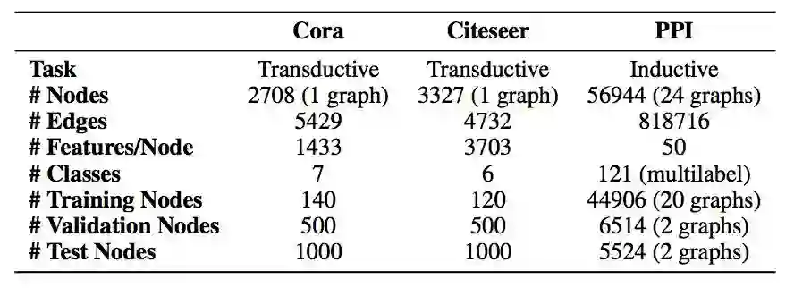 表 2:对 Cora 和 Citeseer 数据集的实验结果(分类准确度)的总结。