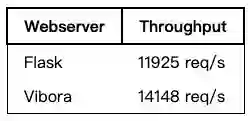 Vibora声称在吞吐量上要比Flask高500%。但是,当我查看他们的基准代码时,发现他们误将Flask配置为每个CPU只使用一个工作进程。更正后,我得到了以下结果: