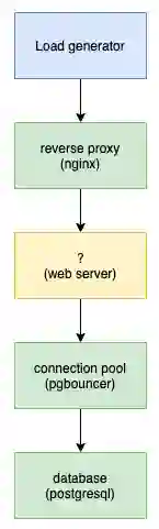 我尽可能地模拟真实世界的部署:一个反向代理,python代码(比如变量),后面再跟着一个数据库。我还加入了一个外部数据库连接池,因为我认为在Web应用程序实际部署中这种做法相当常见(至少对postgresql来说是这样的)。
