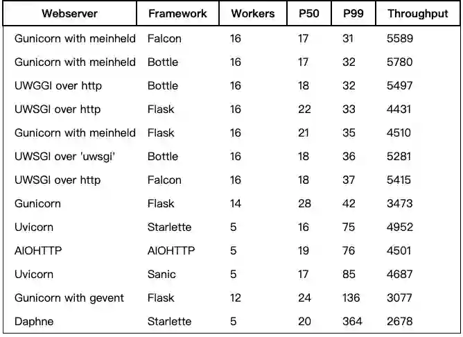 Meinheld和UWSGI(每个约5.3k请求量/秒)包含了大量C语言代码。而标准 Gunicorn(约 3.4k请求量/秒)是纯 Python。